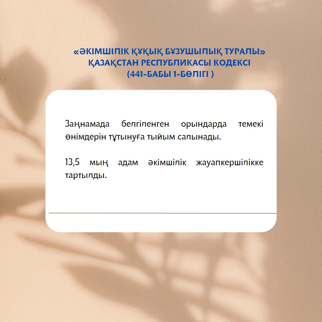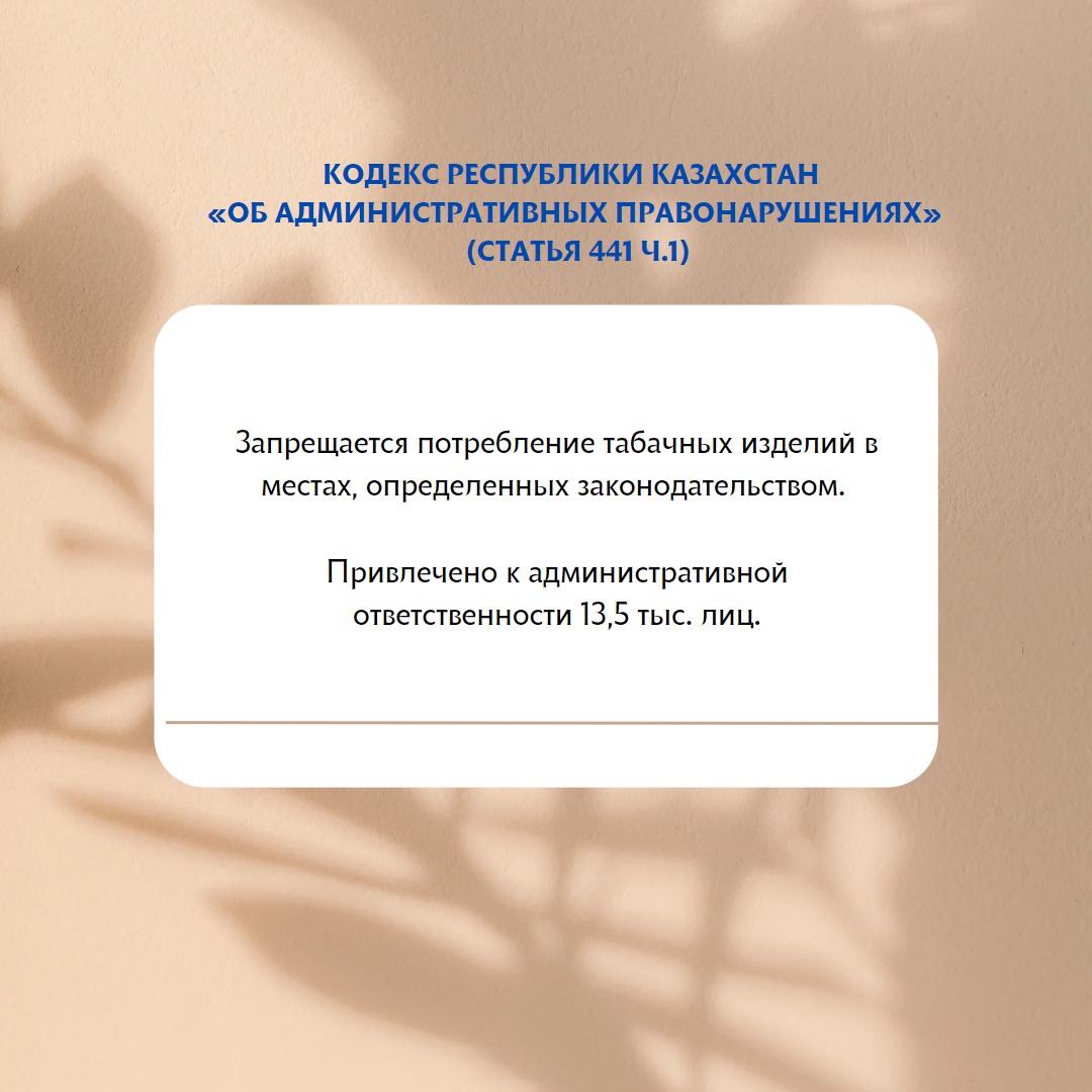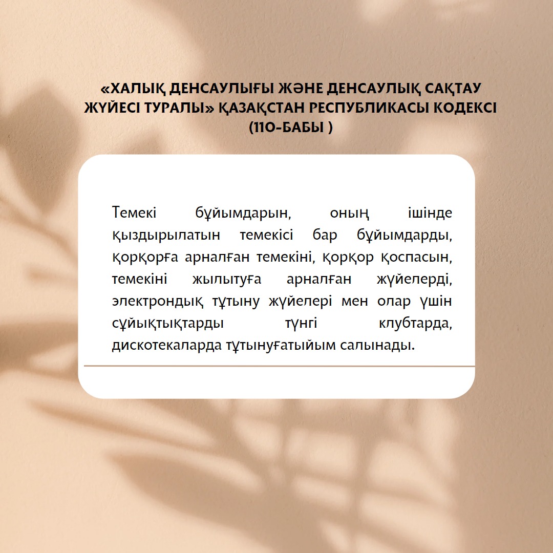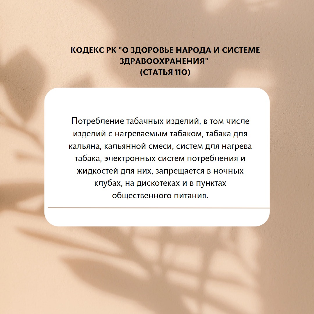 Потребление табачных изделий, в том числе изделий с нагреваемым табаком, табака для кальяна, кальянной смеси, систем для нагрева табака, электронных систем потребления и жидкостей для них, запрещается в ночных клубах, на дискотеках и в пунктах общественного питания (ст.110 Кодекса Республики Казахстан «О здоровье народа и системе здравоохранения»).