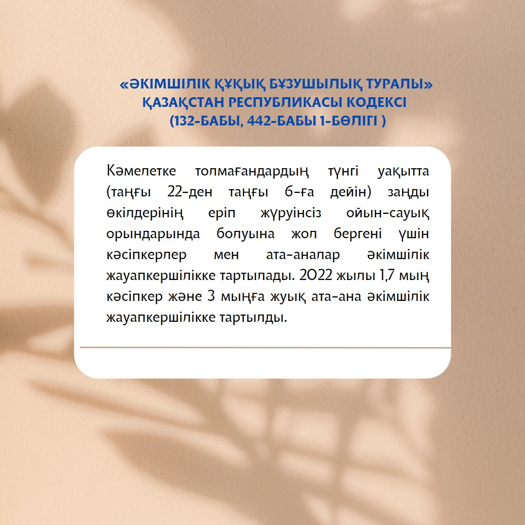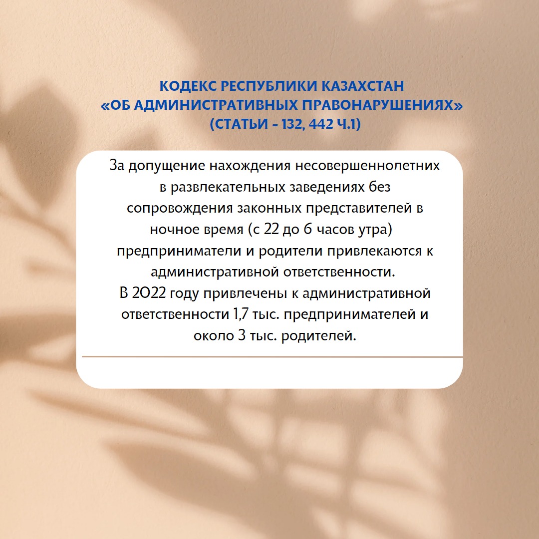 За допущение нахождения несовершеннолетних в развлекательных заведениях без сопровождения законных представителей в ночное время (с 22 до 6 часов утра) предприниматели и родители привлекаются к административной ответственности (ст.132, 442 ч.1 Кодекса Республики Казахстан «Об административных правонарушениях»).