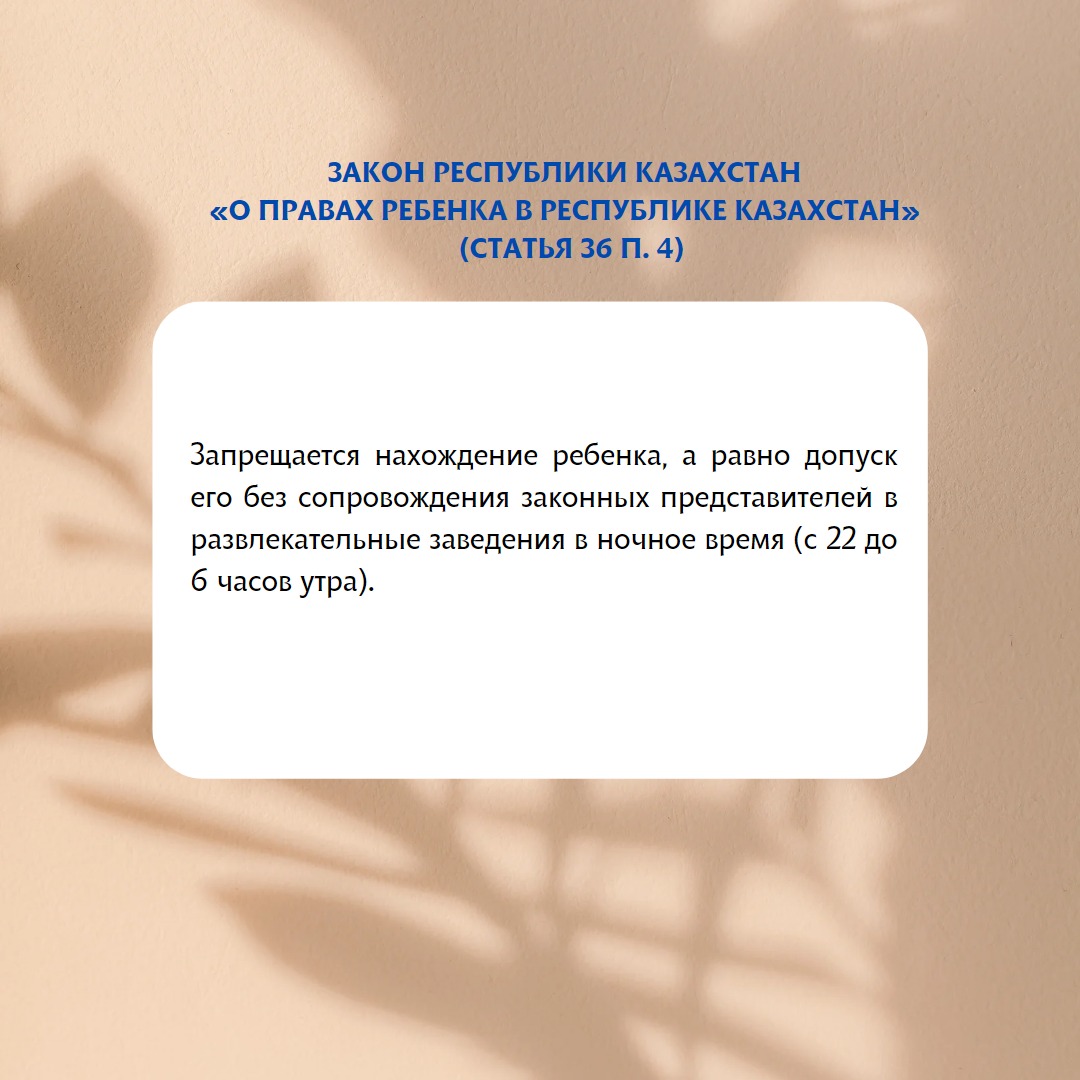 Запрещается нахождение ребенка, а равно допуск его без сопровождения законных представителей в развлекательные заведения в ночное время с 22 до 6 часов утра (п. 4 ст. 36 Закона Республики Казахстан «О правах ребенка в Республике Казахстан»).